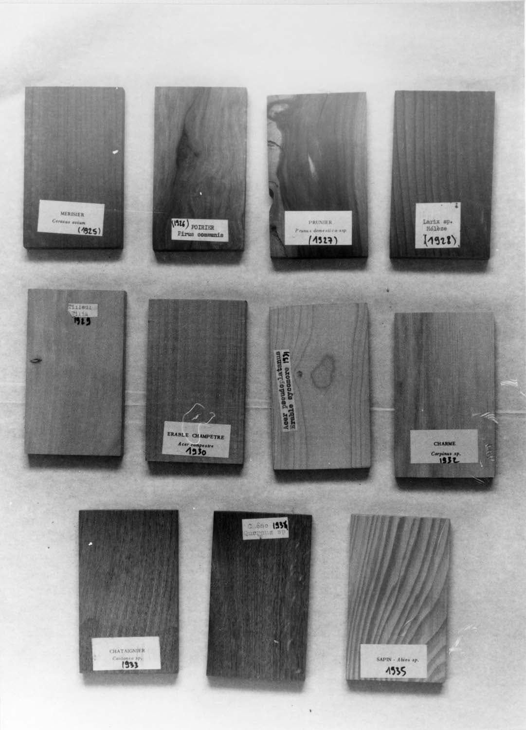 POP | Plateforme ouverte du patrimoineEchantillons de bois : merisier, poirier, prunier, mélèze, tilleul, érable champêtre, érable sycomore, charme, châtaignier, chêne, sapin