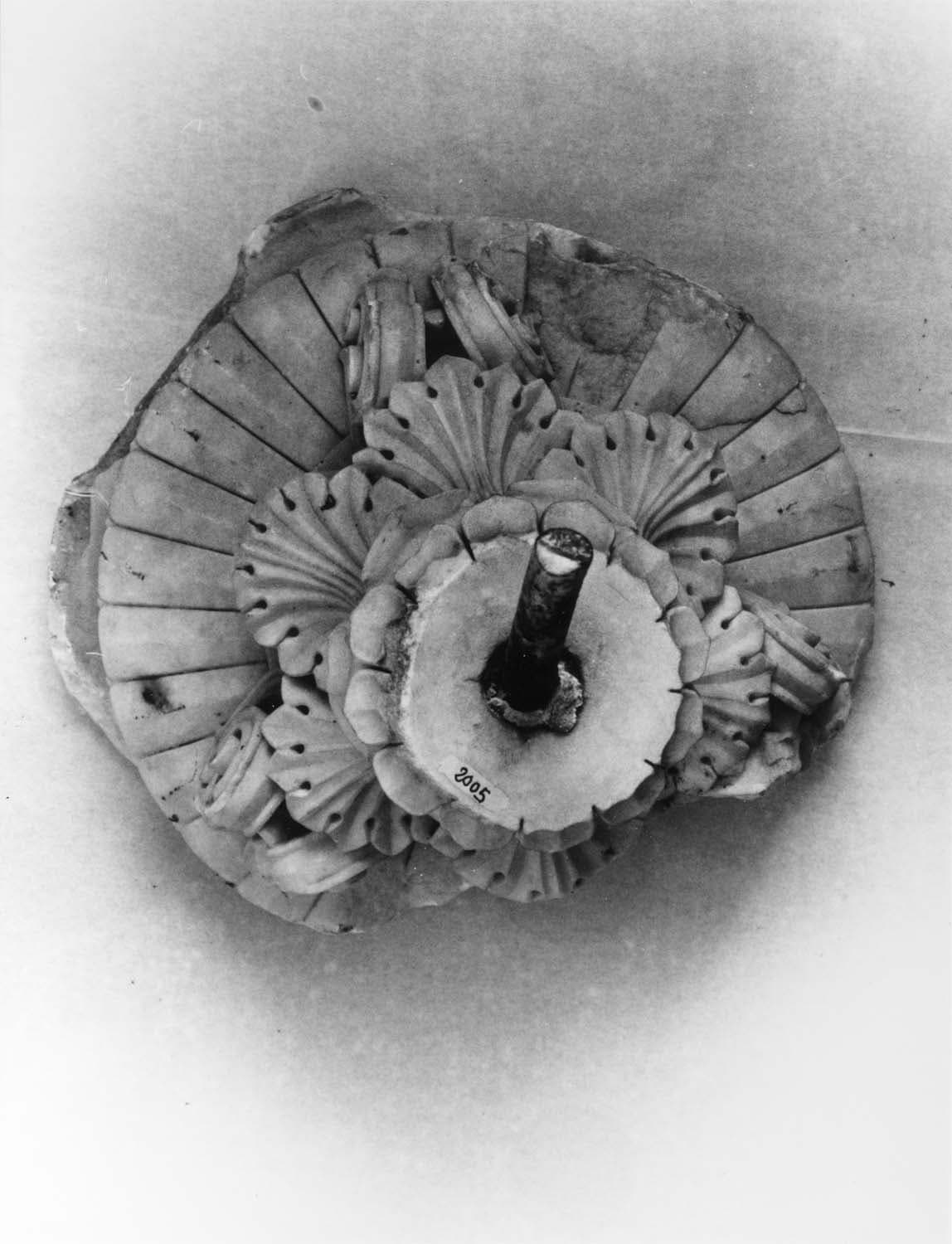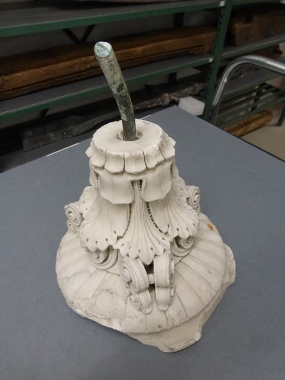 POP | Plateforme ouverte du patrimoineChapiteau en marbre blanc avec goujon en métal cuivreux, provenant de la chapelle. Décor et partie de balustre faisant bras de lumière