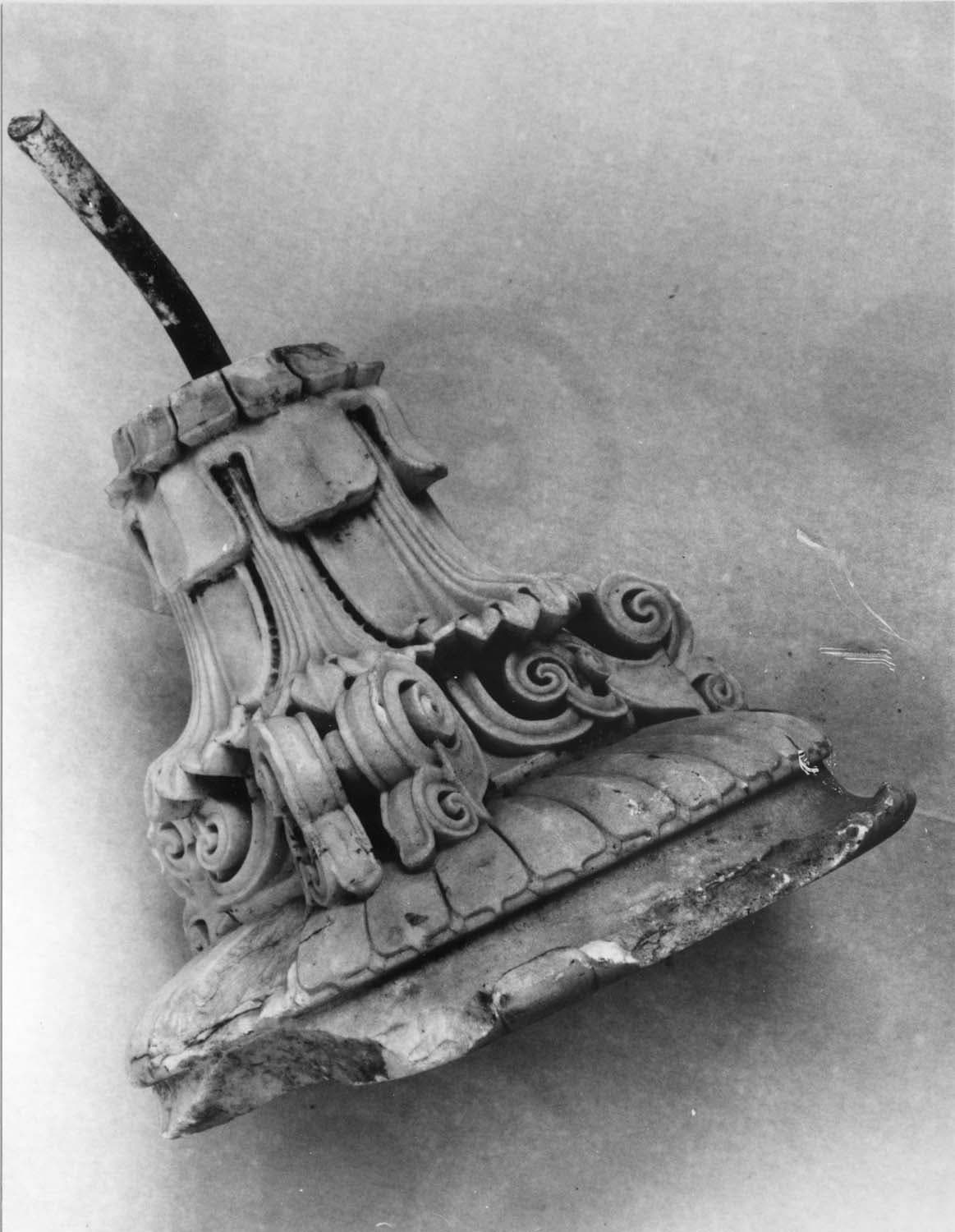 Chapiteau en marbre blanc avec goujon en métal cuivreux, provenant de la chapelle. Décor et partie de balustre faisant bras de lumière