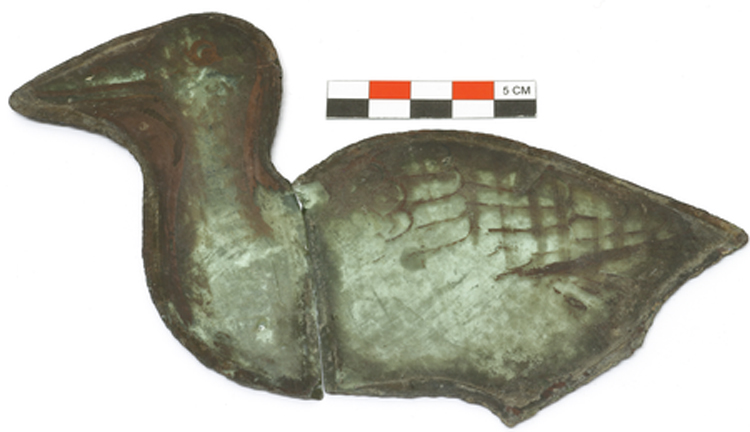 Fragment de vitrail, verre plus mince découpé au grigeoir (grésoir) ; canard