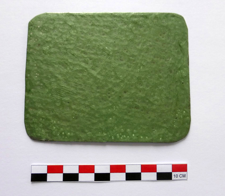 Cet élément de la matériauthèque du CRMH provient du lieu décrit dans le champ « Localisation » ; Échantillon de peinture produit pour la restauration du fanum