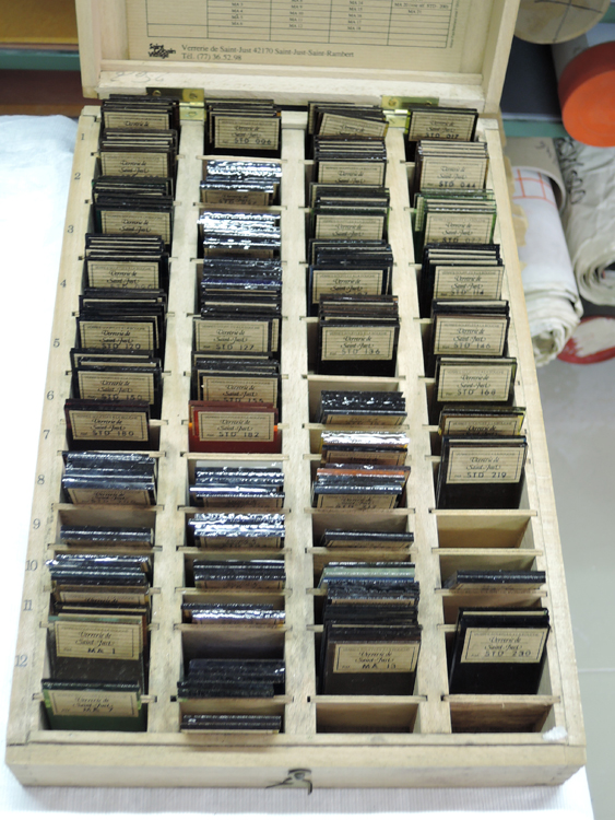 Boîte d’échantillons de verres de la verrerie de Saint-Just-sur-Loire, boîte seule, avec détail du contenu fixé dans le couvercle ‘Gamme des verres soufflés à la bouche’ et 209 échantillons de verre soufflé à la bouche, avec leur référence commerciale