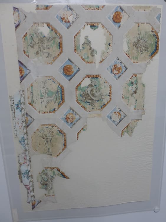 POP | Plateforme ouverte du patrimoinePapier peint : échantillon, trophées insérés dans des caissons octogonaux bordés de perles, cabochon dans les losanges, fond gris, galon stucs végétaux sur fond bleu