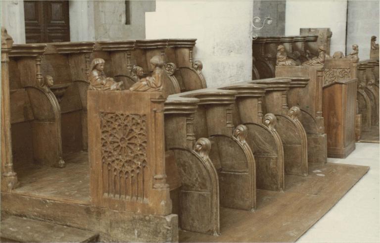 Ces stalles ont probablement été réalisées sous Etienne de Morel vers 1490. Elles étaient alignées contre les arcades latérales et sur le revers du jubé jusqu'en 1792. Certains éléments de ces boiseries ont été démontés à la Révolution pour orner la bibliothèque du château. devenue propriété communale depuis son acquisition, ils sont toujours visibles dans le bureau du maire.