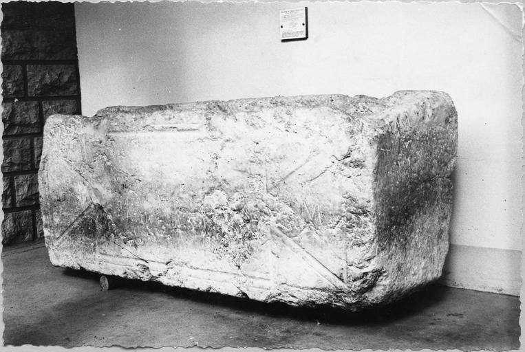 Datation : 3e siècle. Provient probablement de Boursin, hameau d'Anglefort. A servi pendant longtemps de bassin : au coin extérieur de la muraille de la cour de la seigneurie d'Anglefort puis au bas du chemin de la Vuivre, côté sud, près de la route nationale. A ensuite été transporté sous l'auvent de la salle des fêtes le 19/07/1969 sur décision de la municipalité. Inscription dans Corpus 2554 et Allmer 686