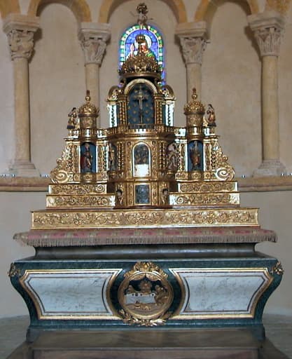 Autel et retable avec statuettes et dômes d'exposition.