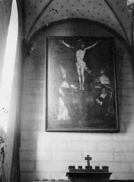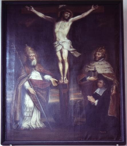 tableau : Christ en croix, deux saints personnages, un donateur agenouillé