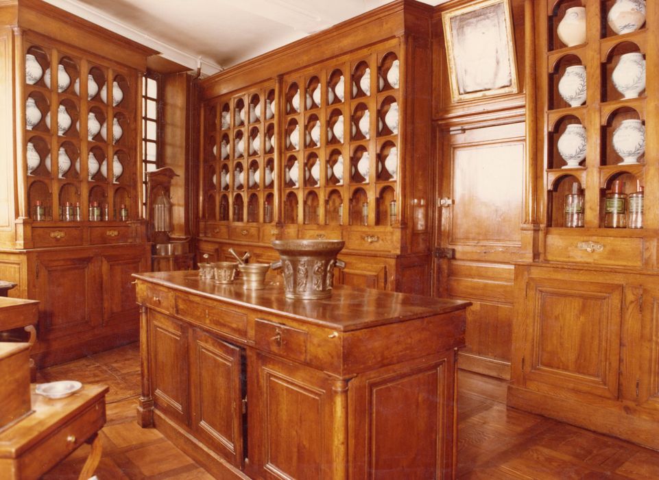 De pharmacie avec son socle en bois. Le mortier est complétement entouré de statuettes de saints en relief. Il est muni de son pilon et son rebord est couvert d'ornements. Le socle de forme octogonale est couvert sur toutes ses faces d'un ornementation sculptée en feuillages imbriquées.