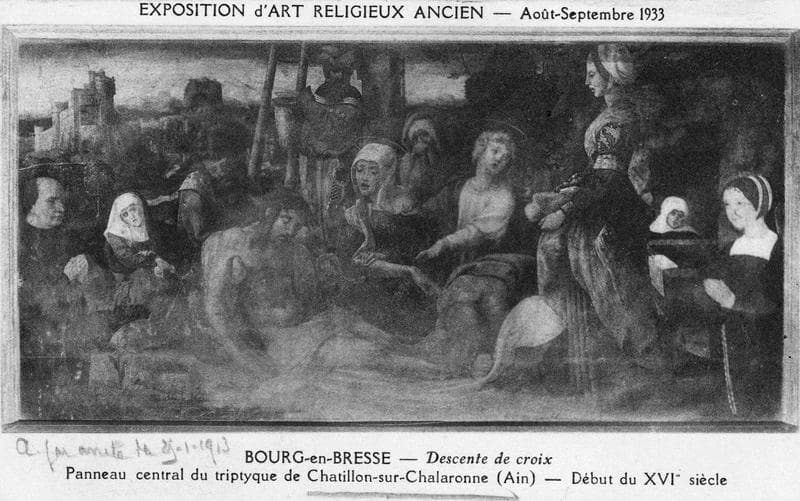Jarrin, Charles. "Richesses d'art du département de l'Ain". In Géographie de l'Ain. Bourg-en-Bresse, Imprimerie centrale, 1885, vol.I, p. 391-397. - p.395, "superbe morceau attribué à Albert Durer, digne de lui par la beauté du groupe et des têtes. Enfumé"
