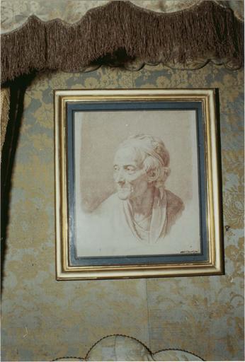 Tableau exécuté d'après le 'Voltaire avec bandeau à l'antique' de Houdon par le peintre français Michel-Barthélémy Ollivier (1712-1784). Tableau postérieur à la mort de Voltaire.