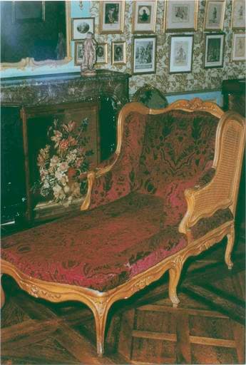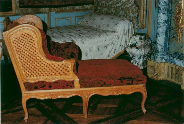 Chaise longue à oreilles cannée d'époque Louis XV recouverte de coussins de velours frappé ; bois : hêtre naturel, mouluré, sculpté.