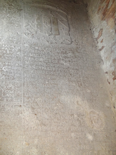 armoiries des diverses alliances de la famille de Crues ; inscription : ICY REPOSE / LE CORPS DE HAUST ET PUISSANT MRE / CAMILLE DE CRUES CHEVAI / LIER COMTE DE ST CROIX / SEIGNEUR DE TANEY NAN / CRAZ QUI A FAIT POUSER CE / TTE PIERRE EN 1727 FILS DE / HAUT ET PUISSANT SGR LOUIS / MARC DE CRUES ET PETIT / FILS DE CRUES CHEVALIER / BARON DE ST CROIX SEI / GNEUR DE TANEY ET / DE CHILOUP GENTIL / HOMME D'HONNEUR / DU DUC DE SAVOYE CA / CAPITAINE DE CENT HOMME / D'ARMES DE LOUIS XIII ROY / DE FRANCE EN 1620 ET / 1630 A FONDE UNE ME /SSE TOUS LES ME / CREDYS DANS LA CHAPELLE / DE LA S VIERGE FILS D'IL / LUSTRE SGR GUY DE / CRUES ENONCE CY DESSUS. Petits cadres latéraux : GUY DE CRUES L'AN 1594 - MARGUERITE D'ARLOS EN BRESSE GEORGE DE CRUES EPOUSA L'AN 1560 - JEANNE DE LA MARQ EN SAVOIE CLAUDE DE CRUES EPOUSA L'AN 1526 - LOUISE D'ARANC DE LACONDAMINE EN FORES RENAUD DE CRUES EPOUSA L'AN 1476 - GUILLEME DE VILLETTE-CHEVRON EN SAVOYE PIERRE DE CRUES EPOUSA L'AN 1436 - JEANNE DE LA BAUMME ST AMOUR EN COMTE HUMBERT DE CRUES EPOUSA L'AN 1402 - JEANNE DE CORDON EN BUGEY PIERRE DE CRUES EPOUSA L'AN 1374 - ANTOINETTE DE GROLE EN BUGEY MICHEL DE CRUES EPOUSA L'AN 1337 - MARGUERITE DE LUERIEUX EN BUGEY AMEDEE DE CRUES EPOSA L'AN 1292 - JEANNE DE GOURVEAU DU PONT DE VEAU EN BRESSE MICHEL DE CRUES DONNE DE SAVOYE EPOSA L'AN 1260 - MARIE DE LA PALUD DE VARAMBON EN BRESSE Sur le bord, a l'angle gauche : BRUNO CALCIA F.