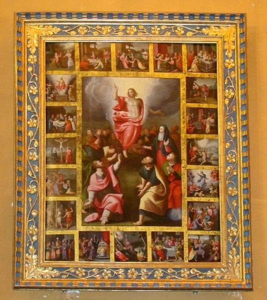 Panneau peint dans un cadre de bois sculpté entouré d'autres petits panneaux représentant les différents scènes de la vie du Christ.