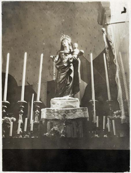 La Vierge maintient l'enfant Jésus assis, qui tient le globe et bénit de la main droite, sur le bras gauche. La Vierge écarte le bras droite du corps, et devait tenir dans cette main un lys.