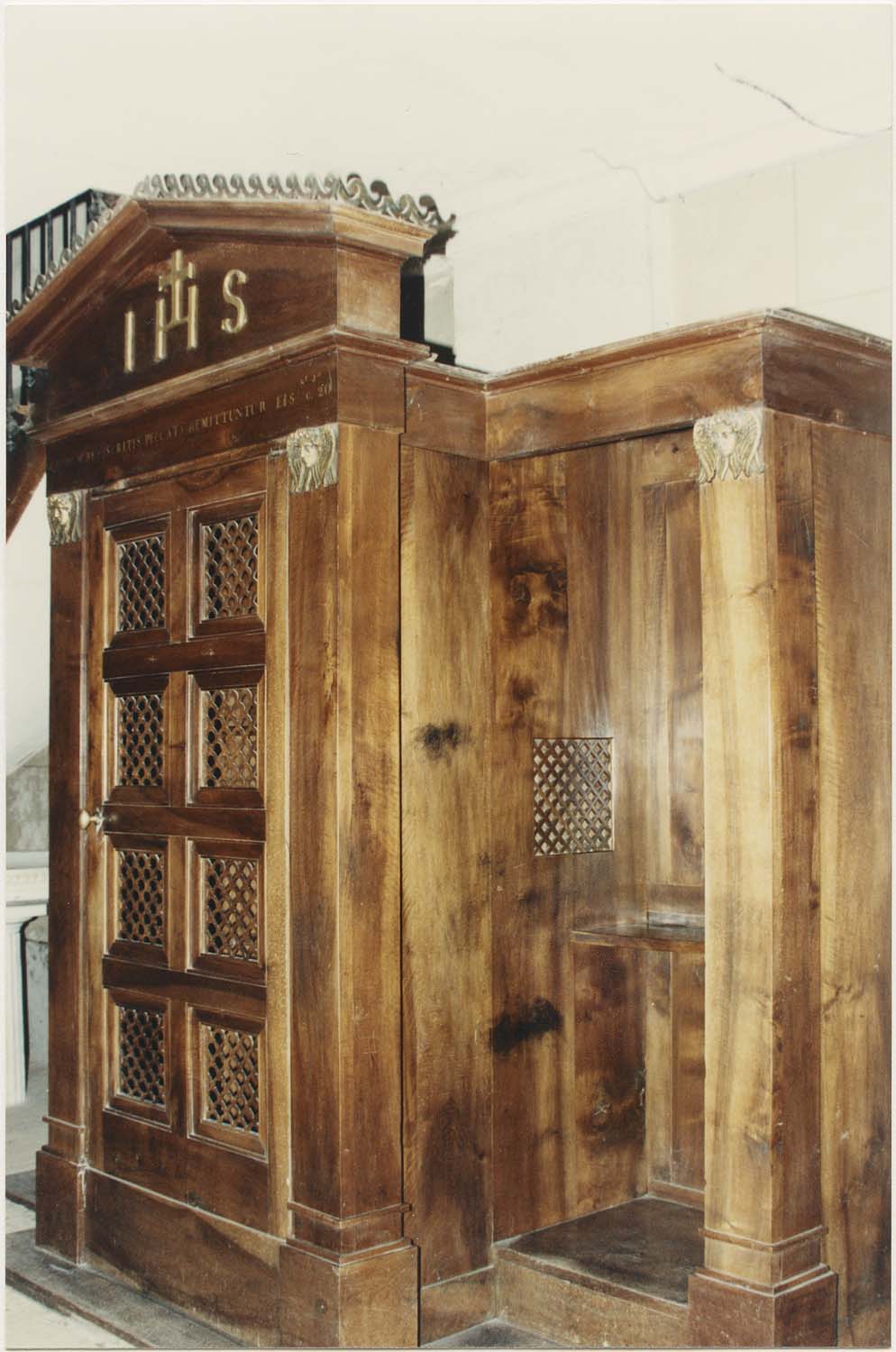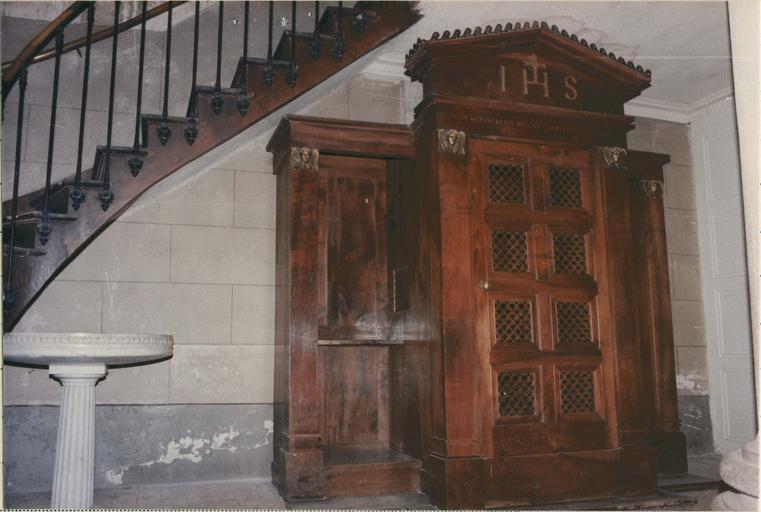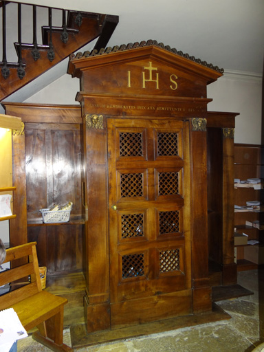 D'après un dessin de Jean-Marie Pollet, architecte lyonnais.Dans l'inventaire des biens de la Fabrique paroissiale de Ferney-Voltaire réalisé le 5 mars 1906, il est mentionné : n?1 / deux confessionnaux 2m50 largeur sur 3m hauteur à trois compartiments, mobiles en noyer, renfermant un crucifix, une banquette et un prie-Dieu (AD de l'Ain 8V33).