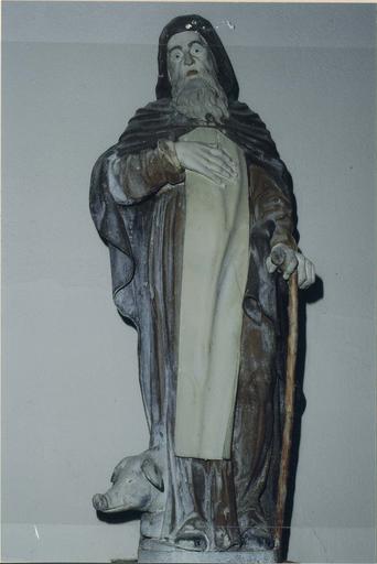 Saint Antoine, barbu est vêtu d'une cape avec capuche rabattue sur la tête, main droite posée sur le coeur, main gauche appuyée sur une canne en forme de tau, petit cochon à ses pieds.