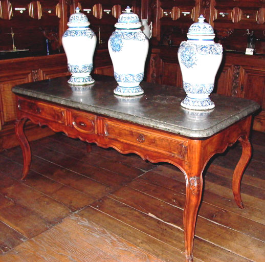 François Page était ébéniste à Lyon. La table a été commandée en même temps que l'achat qui lui avait été fait le 21 novembre 1765 des boiseries et du plafond de la grande pharmacie des Jésuites de Lyon.