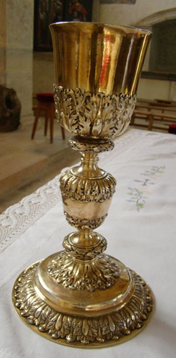 Cet objet possédant tous ses poinçons est facilement datable. L'un d'entre eux correspond à la communauté des orfèvres en 1706, un autre est le poinçon de charge pour les grands ouvrages, de 1703 à 1718 et enfin on trouve le poinçon de maître : celui de Pierre III Barberet, maître-orfèvre lyonnais, actif à Lyon de 1681 à 1715. Par ailleurs se trouvent, sur le bord de la coupe, les mêmes poinçons que sous le pied du calice, ainsi qu'une croix gravée, sur le devant du pied, avec une lance et une éponge entrelacées. Pièce de belle facture qui témoigne de la permanence d'un style dont on connaît des exemples lyonnais assez proches en 1681.
