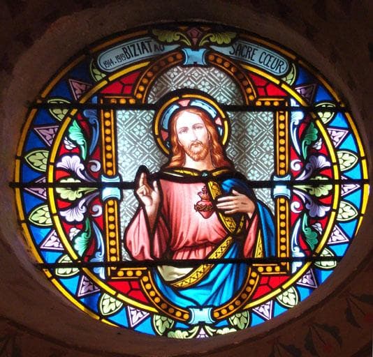 Ensemble de 5 verrières à personnages : Christ ; saint Joseph ; sainte Anne et la Vierge ; Sacré-Coeur ; saint Jean-Baptiste