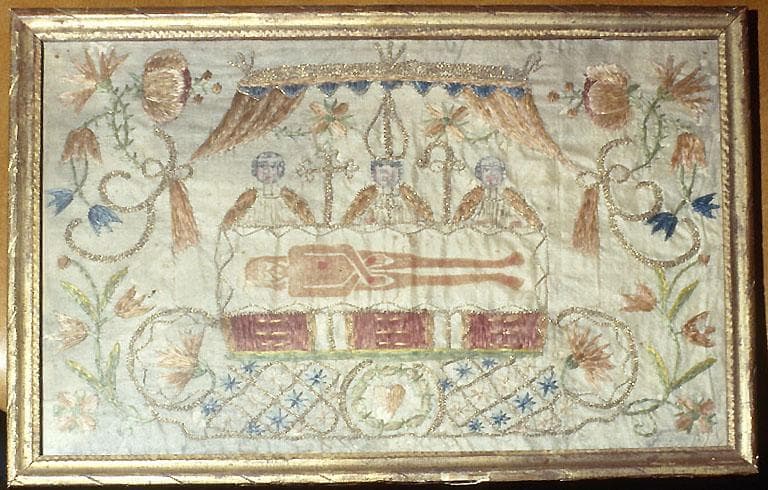 soie : brodé, or, polychrome ; verre ; bois : doré