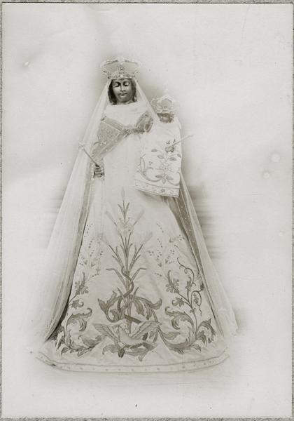 Enfant Jésus de facture postérieure au corps de la Vierge ; visage de la Vierge en plâtre peint en noir ; bras droit en bois refait ; la Vierge se tient debout, l'Enfant Jésus sur le bras gauche ; elle porte des bottes ; la statue est toujours présentée habillée.