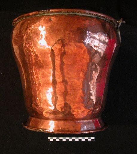 Seau tronconique sur pied à rebord ; anse en fer retenue par deux petits anneaux fixés par deux clous et une plaque de cuivre.