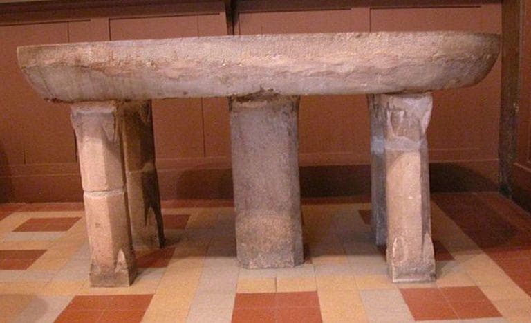 Large plateau de calcaire aux bords chanfreinés posé sur 5 colonnettes prismatiques maçonnées.