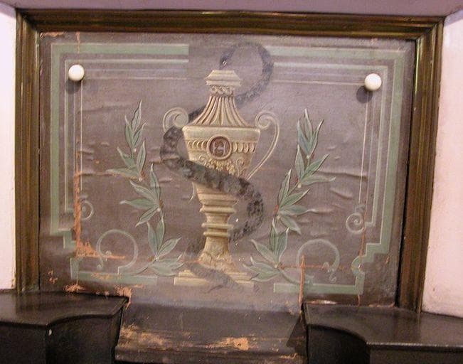 Illustration : pot de montre autour duquel s'enroule le serpent, flanqué de branches de laurier.