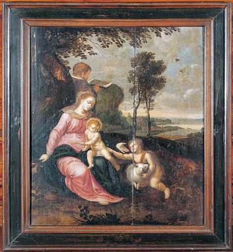 La sainte famille de Châtillon-sur-Chalaronne suit fidèlement le modèle d'une peinture sur bois de Scarsellino (Ferrare 1551-Ferrare 1620) conservée à la galleria Borghèse de Rome (inv. 222). Le tableau s'inspire sans doute, non pas du tableau, relativement peu connu, mais plus certainement de la gravure réalisée dans le même sens que le tableau, de Raphaël Sadeler II (Anvers 1584 - Munich 1632). Le thème intimiste de la sainte Famille, incluant ici le petit saint Jean-Baptiste, s'est surtout développé au 16e siècle sous l'égide des maîtres de la Renaissance italienne, puis au 17e siècle. Contrepoint de la Vie Publique et de la Passion du Christ, le thème de l'enfance cachée offre à la méditation du fidèle un tableau charmant où peuvent se déceler les indices d'une Passion prochaine. La qualité d'exécution du drapé de la robe rose de la Vierge, la subtilité des coloris employés pour ce même vêtement ainsi que pour les carnations révèlent une copie de belle facture. La disposition des personnages, l'ambiance sereine et intimiste évoquent une série d'oeuvre parallèle produite dans les Flandres en ce début de 17e siècle. Les saintes familles de Van Balen (1575 - 1632) et de Pieter von Avont (1600-1632) inscrites dans les guirlandes de fruits, de fleurs et de légumes de Jan Bruegel le Jeune, restituent, dans le cadre de sous bois ombragés et reposants, une atmosphère bien proche de l'uvre de Scarsellino.