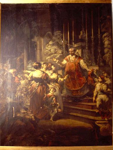 Saint Vincent-de-Paul vêtu d'une chasuble de couleur orangé devant des personnages en habit d'apparat.