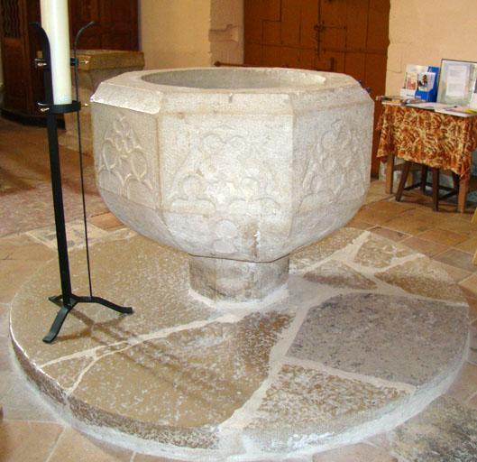 À l'origine, fonts baptismaux encastrés dans le mur avec niche fermée par une porte en bois peint ; cuve et pied à 8 côtés ; décor de remplages trilobés sur la cuve ; sur la porte : décor peint en camaïeu de gris : vase surmonté de flammes et d'un coeur enflammé posé sur un socle avec inscription.