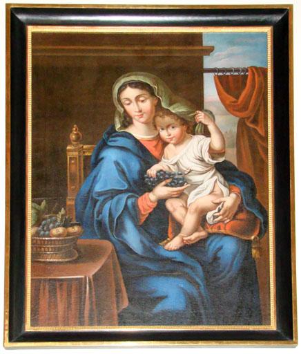 Décor d'intérieur ; paysage en fond à droite derrière le rideau ; la Vierge assise sur une chaise devant une table juponnée avec corbeille (?) posée dessus ; elle présente une grappe de raisin à l'enfant. Assis sur un coussin sur les genoux de sa mère, il semble se cacher sous son voile.