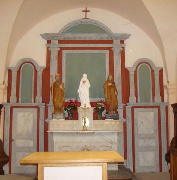 Bois peint faux bois, faux marbre gris (pilastres) ;