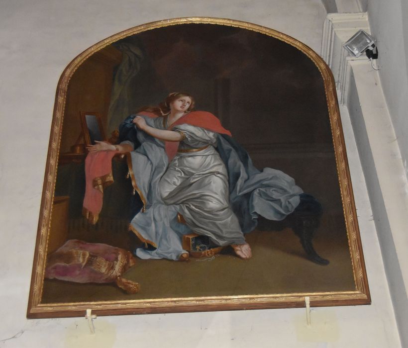 Lieu dexécution : Languedoc-Roussillon ; 31 ; Toulouse. Copie d'après Lebrun. Jean-Antoine Sicard : peintre toulousain du 18e siècle; il est l'auteur de 5 tableaux conservés à l'église Notre-Dame de Bourg-en-Bresse commandés par la confrérie des pénitents du Confalon de Notre-Dame en 1755. Dans l'inventaire des biens de la Fabrique paroissiale de Saint-Trivier-sur-Moignans réalisé le 3 février 1906, il est mentionné : n°99 / à gauche de la porte principale tableau suspendu Ste Madeleine renonçant aux vanités du monde (AD de l'Ain. Série V : 8V60).