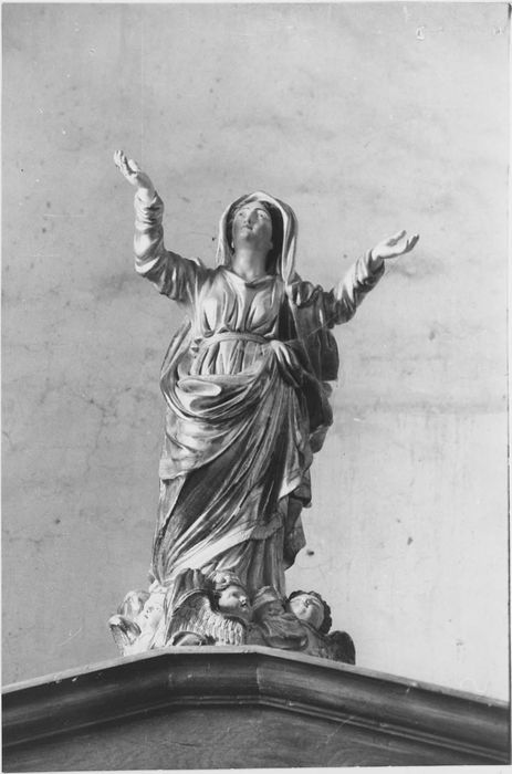Vierge bras levés au ciel reposant sur des nuées et des têtes d'angelots.