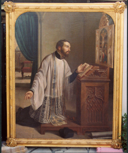 Antoine-Désiré Mazaroz : 1814-1876, peintre né à Lons-le-Saunier (Jura). Mars 2006 : l'hypothèse avancée par M. Roger Brunet de Pont-de-Veyle qui indique qu'il s'agirait plutôt de la représentation de saint François-Xavier peut être envisagée à la vue du détail du parchemin roulé en bas à droite du tableau, non visible avant sa restauration. Néanmoins, saint François-Xavier ne s'embarque de Lisbonne pour Goa que le 7 avril 1541 ; l'inscription ' d'Asie ' et la date 1538 peuvent également souligner les futures missions d'évangélisation qui seront lancées par saint Ignace, fondateur de la Compagnie de Jésus. Au moment de l'inscription du tableau au titre des Monuments Historiques le 2 janvier 1996, le personnage avait été identifié comme étant saint Ignace agenouillé devant une crucifixion avec ses attributs habituels (vêtu de la soutane noire de jésuite avec surplis et étole, sa barrette romaine à ses pieds). Son compagnon saint François-Xavier est plutôt représenté avec un crucifix brandi ou sur la poitrine, ou avec un crabe qui ramène le crucifix tombé à la mer.