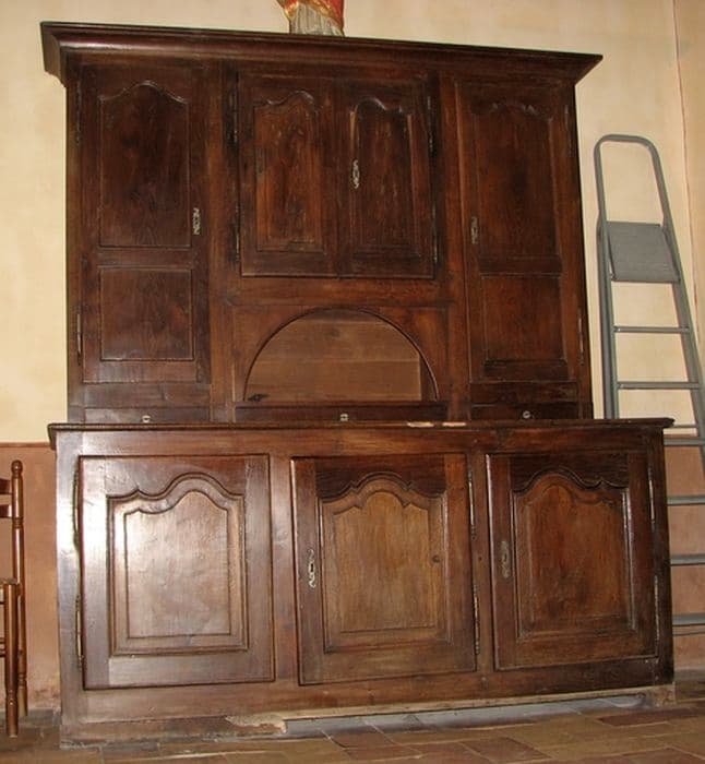 En bois, avec trois ouvrants en partie basse, buffet supérieur avec deux panneaux latéraux, une niche en partie centrale surmontée d'un placard.