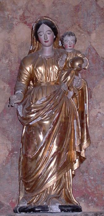 La Vierge est debout, porte l'enfant Jésus sur son côté gauche, la main droite écartée du corps. L'enfant bénit de la main droite et tient contre lui un globe.