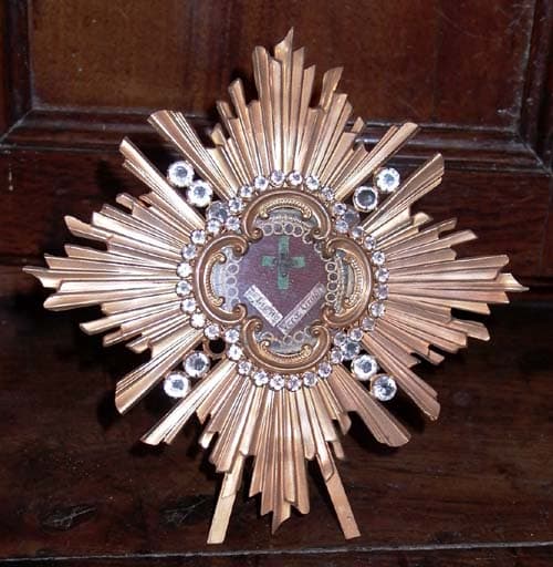 Quadrilobe rayonnant entouré de fausses pierreries ; relique de la sainte-croix ; anneau au dos formant pied et poignée.