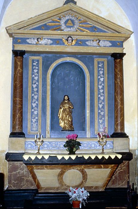 Autel de forme trapézoïdale décoré d'un cercle ; retable néoclassique à fronton triangulaire avec croix sommitale (décor : triangle rayonnant) sur un bandeau à décor d'anges ailés, reposant sur 2 colonnes à chapiteaux doriques ; un gradin à rinceaux sous une niche en hémicycle cantonnée de panneaux à décor de vigne?