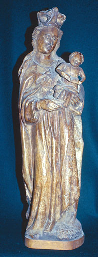 La Vierge porte l'Enfant sur son bras gauche. Elle est vêtue d'une robe et porte une cape agrafée au niveau de la poitrine. Elle est coiffée d'une couronne. L'Enfant est partiellement enveloppé dans un tissu (partie inférieure du corps) et tient un livre ouvert dans les mains.