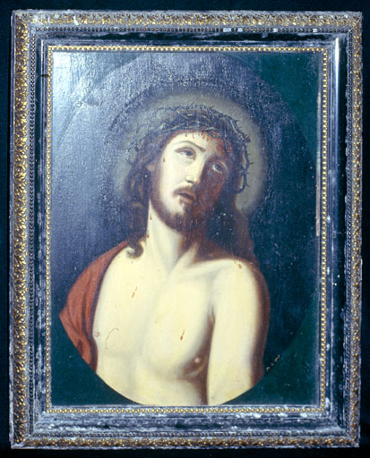 La figure en buste est peinte dans une forme ovale ; le Christ couronnée d'épines, à l'épaule droite couverte du manteau rouge, lève les yeux au ciel dans un mouvement de prière.