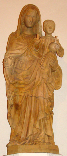 Ronde-bosse en bois de tilleul décapé ; le visage manquant de l'enfant Jésus et les doigts de la Vierge ont été restitués au cours de la restauration.