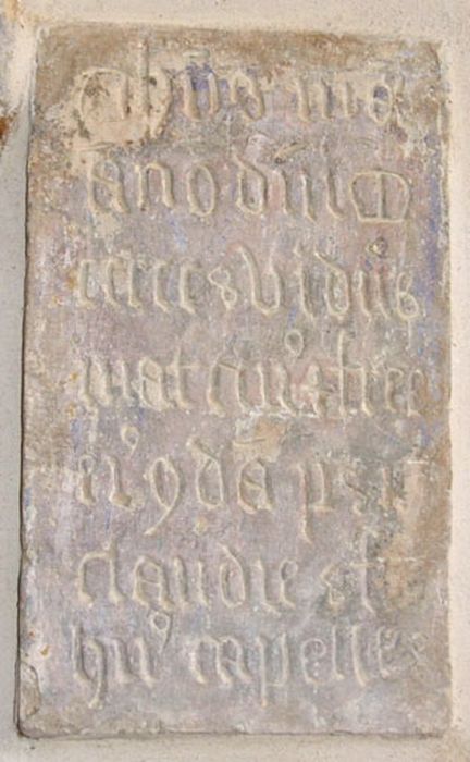 Plaque rectangulaire en pierre avec inscription gravée en écriture gothique abrégée.