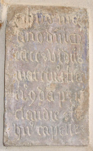 inscription : I[E]H[S]US M[ARI]A / AN[N]O D[OMI]NI M / CCCCC ET VI D[OMINU]S / MARTIN[US] ET FR[AT]ER / EJ[US] [QUON]DA[M] PSI / CLAUDIE SF / HU[JUS] CAPELLE ; transcription : Jésus Marie / l'an du Seigneur mil cinq cent six dom Martin et ses frères, anciennement du monastère de Saint-Claude sont les fondateurs de cette chapelle (traduction de Charles Perrat, professeur à l'Ecole des Chartes, 1959) source Paul Cattin.