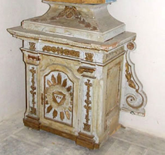 Peint en faux marbre blanc décoré du symbole de la trinité, un triangle sculpté rayonnant dans des nuées sur la porte ; ornementation dorée sur le reste du tabernacle.