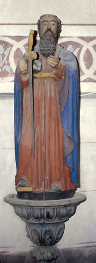 Epée désolidarisée ; à restaurer ; 05/10/2005 : à traiter ; traitement au rayonnement Gamma et constat d'état établi par Arc-Nucléart en 2006-2007 : observation de la structure : Les dimensions et la forme du pommeau de l'épée ne permettent pas de confirmer son appartenance à l'uvre. Il pourrait s'agir d'un ajout ou une restitution réalisée pour compenser la disparition de l'attribut original. La découpe particulière du pommeau peut également indiquer l'appartenance de cet attribut à une autre sculpture. Une profonde fissure verticale partage l'uvre par son milieu jusque sous la base et remonte jusqu'à la base de la barbe. Les côtés droit et gauche du saint sont des pièces de bois rapportées avant la taille. Le côté droit est lui-même constitué d'un assemblage de deux morceaux. Le sommet du crâne comporte, lui aussi, un petit élément rajouté avant la taille. On n'observe pas de traces d'assemblage, les éléments sont probablement chevillés et collés. Les fissures sont, par endroits, recouvertes par la polychromie. L'absence de fissure sur les mains indique qu'elles ont été taillées séparément, puis assemblées. Une longue fissure court le long de la joue gauche. Elle part de la pièce rapportée au sommet, descend le long de la tempe gauche, la barbe et suit le cou jusqu'à la naissance de la grande fissure verticale. Ces fissures sont dues au séchage du bois. A l'intérieur de la main gauche, on observe sur l'extrémité des doigts des dépôts de peinture rouge et des traces de frottements. Ils pourraient provenir d'un ancien attribut. Sous la base, le bois a été retaillé, ce qui fait pencher la sculpture en arrière. Au revers de l'uvre, la base a également été retaillée, sans doute pour permettre un bon positionnement sur son lieu d'exposition (corniche ? Cf. Saint Pierre n° 1om1505). L'épée est constituée de deux éléments anciennement assemblés par collage. L'élément qui comprend la lame et la garde est aujourd'hui séparé du pommeau. Le bois a subi une légère attaque d'insectes xylophages sans dégradation notable, hormis la présence de quelques trous d'envol. Attention : bien que stable, la semelle n'est pas régulière (retaillée), la sculpture penche dangereusement en arrière. Selon le mode d'exposition, sa stabilité pourrait nécessiter un renfort. Observation de la surface : On observe un encrassement uniforme avec de fortes accumulations dans les creux. Trois couches de polychromie successives recouvrent une fine couche de préparation. Une étude de polychromie doit être envisagée. Quelques lacunes de polychromie, dues à des frottements, sont observées. Elles sont plus nombreuses sur le brun violacé qui recouvre l'intérieur du manteau. Au revers de l'uvre, la base du manteau présente quelques auréoles d'humidité.