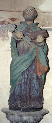A restaurer ; 05/10/2005 : à traiter ; traitement au rayonnement Gamma et constat d'état établi par Arc-Nucléart en 2006-2007 : observation de la structure : Un livre en bois sculpté est conservé séparément. Cet attribut prend place dans la main gauche. Il est légèrement plus large que l'espace aménagé dans la main. Il pourrait donc s'agir d'une restitution postérieure, à la suite de la disparition de l'attribut original. L'altération principale est une large et profonde fissure de dessiccation qui part de la base du cou et descend jusqu'au pied droit. Deux autres fissures délimitent des éléments qui peuvent être des assemblages réalisés avant la taille de l'uvre. Ces éléments constituent les côtés droits et gauche du personnage. Une radiographie X permettrait de déterminer s'il s'agit réellement d'assemblages réalisés avant la taille ou de fissures plus récentes. Les fissures sont partiellement recouvertes de polychromie. Elles existaient donc déjà lors du dernier repeint. Leur mise au jour indique que les mouvements du bois continuent. Sur le côté droit, plusieurs fissures horizontales suggèrent que ce côté est un assemblage de plusieurs pièces rapportées. Au revers, la base du manteau a été retaillée, probablement lors de la mise en place de l'uvre à son dernier emplacement connu (cf. photo d'archive : saint Pierre sur une corniche, adossé à un mur). La même photo d'archive montre que la statue était exposée dans un lieu humide (altération des peintures murales derrière elle). A cette époque il n'y avait encore pas la grande fissure précédemment citée. Elle s'est donc produite au cours du séchage postérieur à son déplacement. Au revers de l'uvre et sous la base, on observe de larges auréoles d'humidité et des traces de moisissures. D'autres moisissures peuvent être observées sur la partie inférieure du vêtement du saint. Elles sont apparemment le fait de projections de matière organique qui auraient moisi. Deux types de moisissures sont visibles : une récente, blanche, étoilée avec une auréole brune et brillante de séchage ; et d'autres, plus anciennes, brun foncé. Sur le visage, une fissure partiellement recouverte de polychromie fait le tour de la tête sur le plan latéral. Elle passe sous le cou, remonte sur les tempes et se rejoint au sommet du crâne. Ici aussi, il s'agit peut être d'un assemblage réalisé avant la taille. A confirmer par radiographie X. Il n'y a pas de trace d'assemblage mais une salissure sombre, sur la fissure côté dextre, est peut-être un résidu de collage. Le col du manteau est fissuré sur toute son épaisseur, côté senestre. La fissure est ouverte et laisse apparaître une interface de cassure très nette. Sous la base, un petit manque provoqué par clivage a été restitué avant l'application du dernier repeint. L'attaque d'insectes xylophages est extrêmement limitée, deux trous d'envol ont étés répertoriés sur la sculpture. Il est intéressant de noter que le livre est beaucoup plus infesté, ce qui semble confirmer l'hypothèse qu'il ne soit pas original. La clef est légèrement mobile. observation de la surface : L'oeuvre présente un encrassement important, essentiellement constitué de poussière ; on observe aussi de très fortes accumulations dans les creux, des cocons d'insectes et de nombreuses moisissures (partie inférieure du vêtement). Trois couches successives de polychromie sont observées. Une étude de polychromie est nécessaire. Le dernier repeint présente de nombreuses lacunes qui laissent penser que le repeint sous- jacent est en bon état.