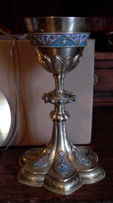 Le calice est en vermeil. La coupe est évasée, le noeud est plat avec des cabochons en émail et le pied est polylobé avec des médaillons émaillés. La patène est gravée.