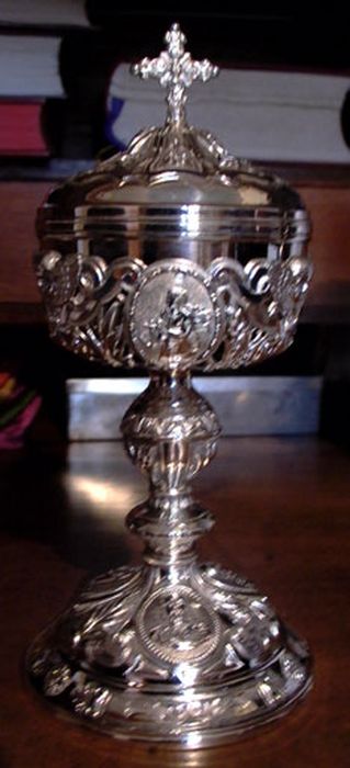 Formé d'un pied circulaire, d'une fausse coupe ouvragée ; argent, décor repoussé.